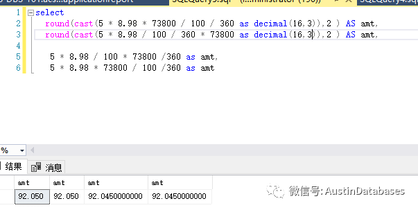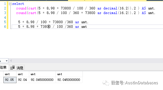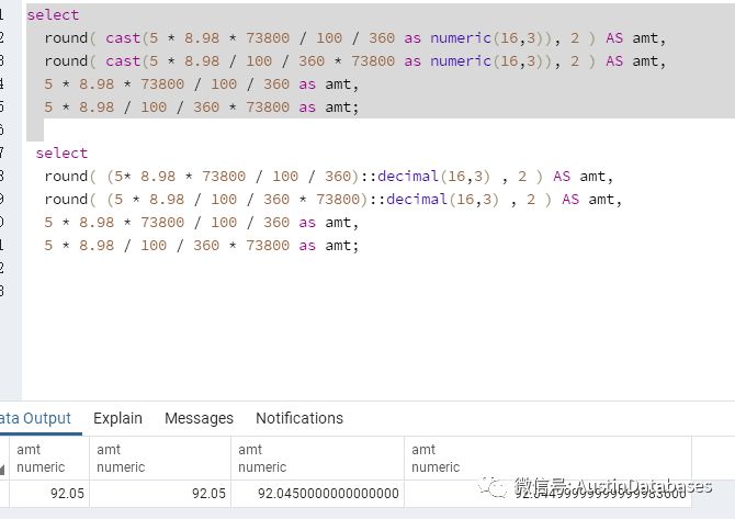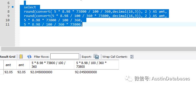 这里MYSQL的处理方式稍微不同,虽然我们添加了 decimal 但如果还是保留2位小数,则结果还是不对,这里比需要的值多保留一位,则结果就一致了。