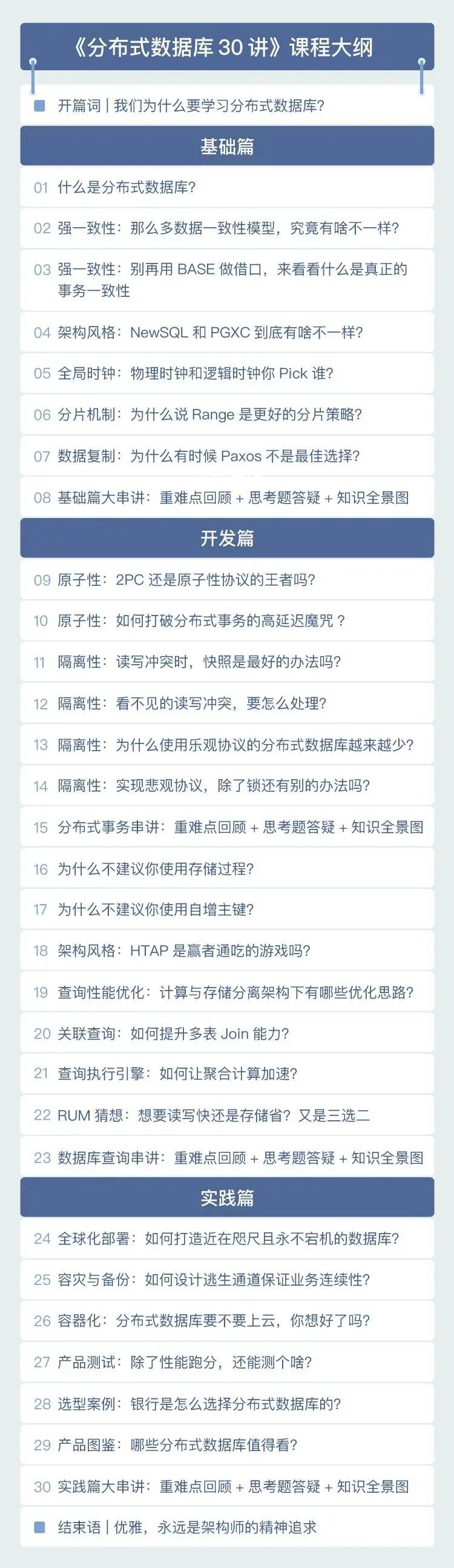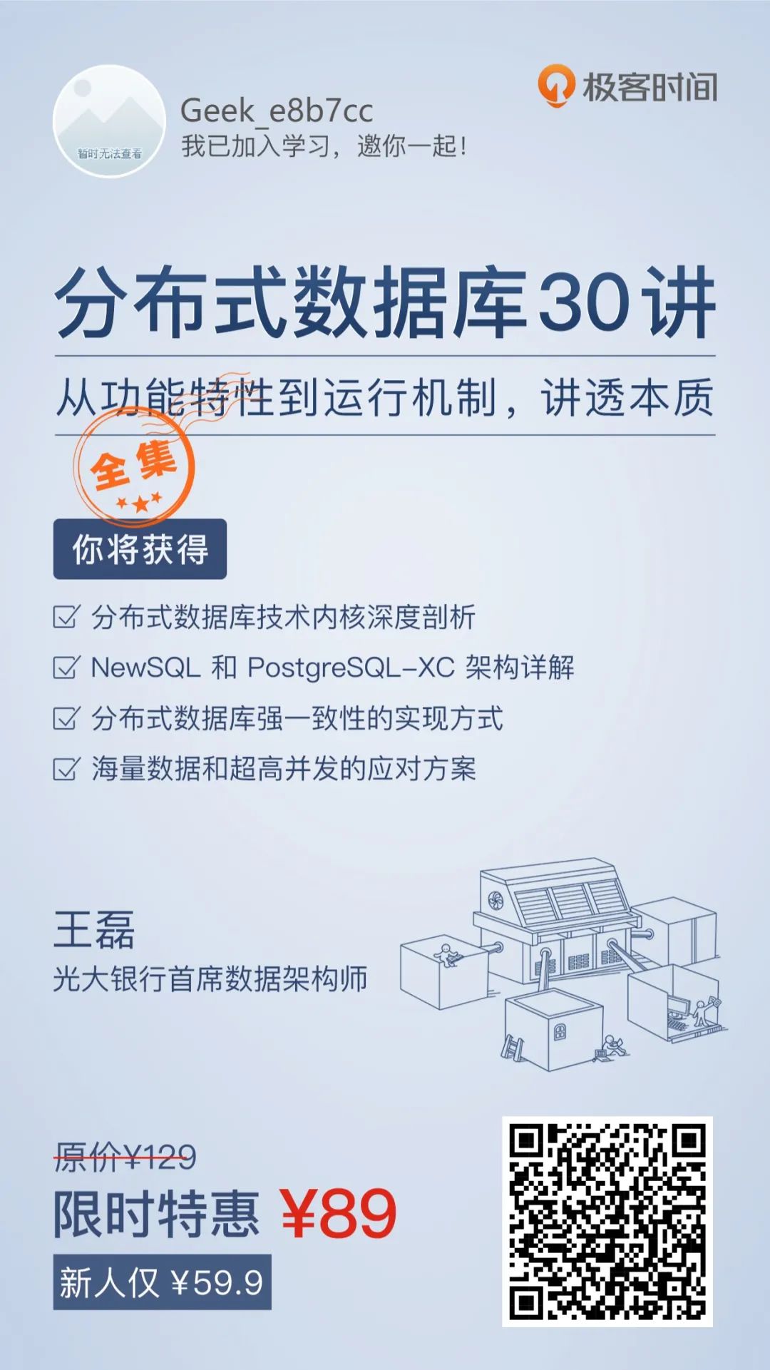 专栏一共 34 讲,现已全部更新完毕。深度剖析了分布式数据库技术内核,详解了 NewSQL 和 PostgreSQL-XC 架构。