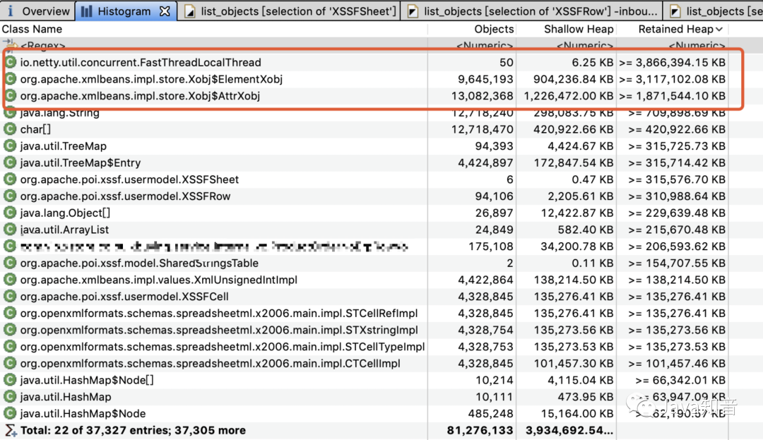 可以看出POI的对象以及相关的XML对象占用了绝大部分的内存消耗,频繁FGC说明这些对象一直存活,没有被回收。