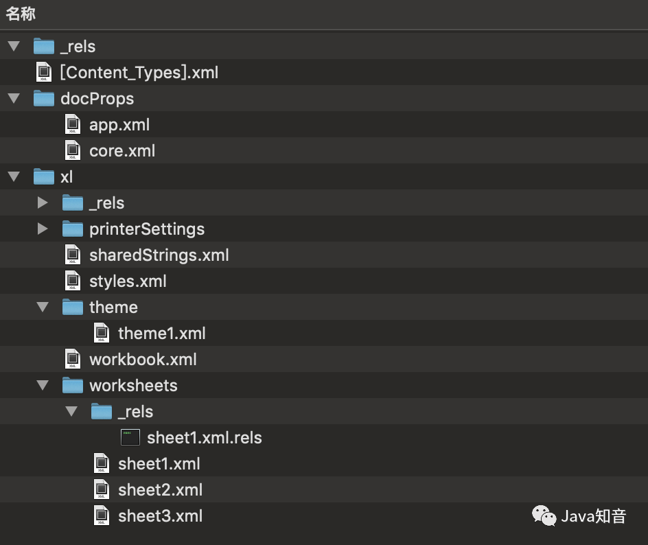 07版的XLSX则是采用OOXML(Office Open Xml)的格式存储数据。简单来说就是一堆xml文件用zip打包之后文件。这个对于大家来说就熟悉了,把xlsx文件后缀名改为zip后,再解压出来就可以看到文件结构