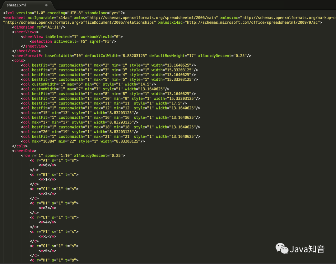 打开sheet1.xml,可以看到是描述第一个sheet的内容