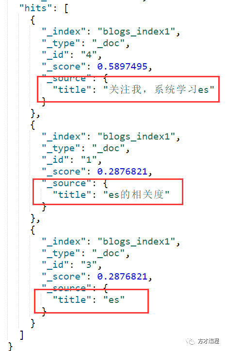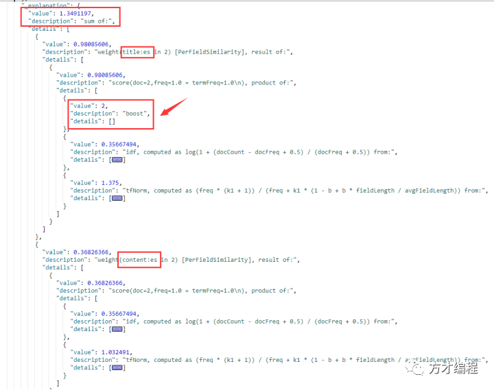 根据结果,我们可以看到:对应文档的_score = BM25(es in title) + BM25(es in content);其中BM25(es in title)= boost * idf * tfNorm