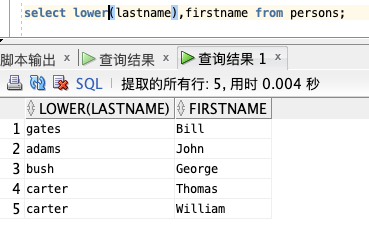 选取 “LastName” 和 “FirstName” 列的内容,然后把 “LastName” 列转换为小写: