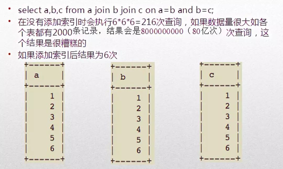 从上图可以看出,所有表的type为all,表示全表索引。也就是6 6 6,共遍历查询了216次。