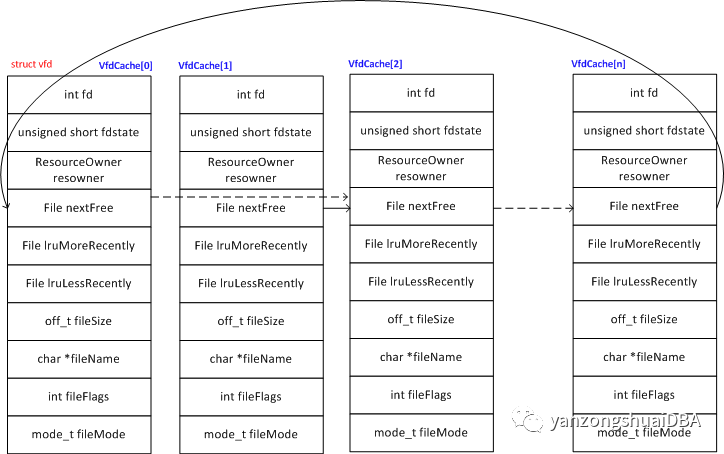 2)首先会判断free链表中是否为空。初始时刻,SizeVfdCache为1,则会将VfdCache初始化成大小32的数组,并将其通过nextFree串联起来形成free链表,注意该free链表为循环。