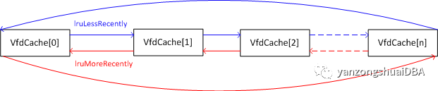 ReleaseLruFile->LruDelete(VfdCache[0].lruMoreRecently);->vfdP = &VfdCache[file];close(vfdP->fd);vfdP->fd = VFD_CLOSED;--nfile;Delete(file);-->vfdP = &VfdCache[file];VfdCache[vfdP->lruLessRecently].lruMoreRecently = vfdP->lruMoreRecently;VfdCache[vfdP->lruMoreRecently].lruLessRecently = vfdP->lruLessRecently;