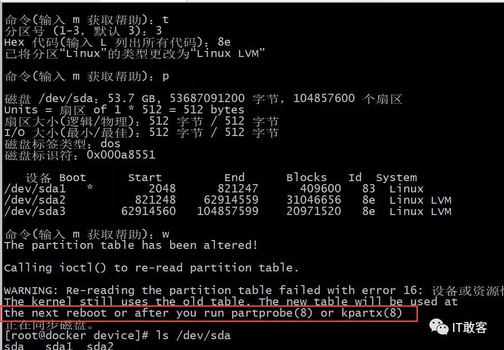 所以这时候要么 reboot 重启,要么运行 partprobe 要么运行 kpartx 命令。所以这里我在运行一下 partprobe 命令后,发现/dev/sda3 出来了。
