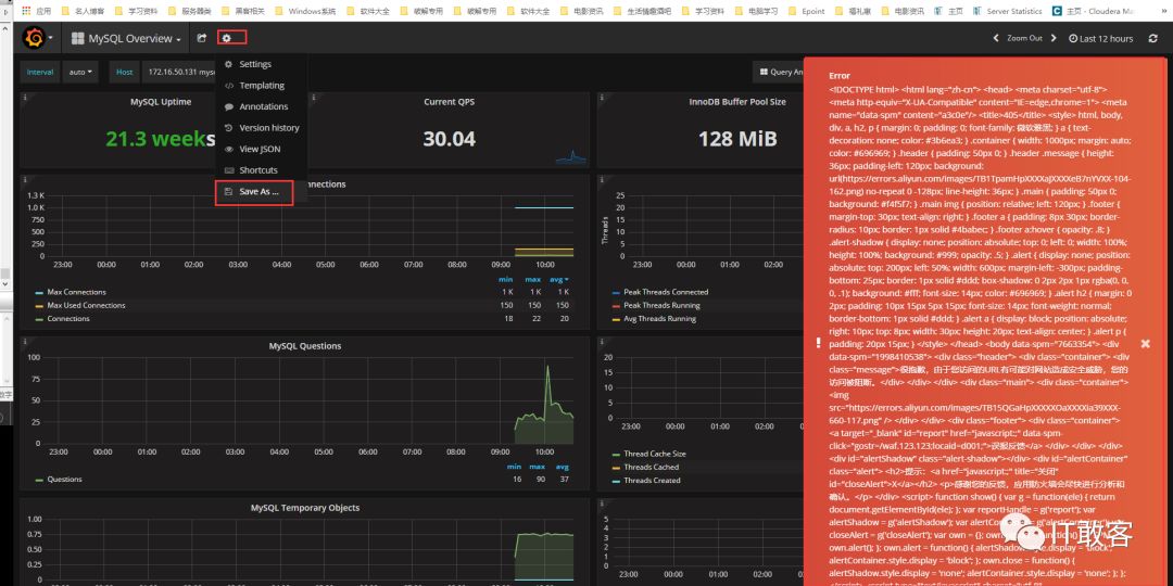 拿其中一个 MySQL_Overview 的 dashboards 来说(前提我已经安装了 Prometheus 收集了各台 mysql 的数据信息),默认打开的时候里面的表格大小不一,而且部分没有监控数据,这时候我们一番调整后,发现下次刷新,又恢复成默认的样式了,于是我们尝试将这个 MySQL_Overview 另存为一个新的 MySQL_Overview Copy 的 dashboards 出来,结果意外发生了,不能保存,如下图所示会报错,这样对于每天需要打开监控的时候就麻烦了。