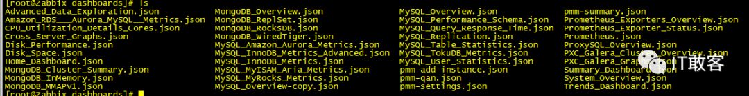 那么,怎么办呢,我的 Grafana 版本是 4.6.2,期间我也升级到最新的 5.3.0,发现有些 dashboards 消失了,索性又换回了原版本,这里遇到这种情况不要慌,还是有解决办法的,经过我在 grafana 的服务器上一番探索后,发现默认的 dashboards 模板文件都是放在/var/lib/grafana/dashboards 目录下,所以我们也可以自己新建一个模板文件既可,我们发现模板文件都是 json 格式的文件如下图所示:所以我们只要找到这些 json 格式的内容即可。