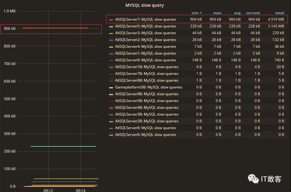 然后 grafana 上显示 900 多 k 的值其实是慢查询的总条数,也就是 show variables like ‘%slow_query_log%’;查询出来的值。