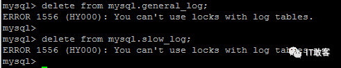 无法直接删除,如果直接删除的话,会出现“ERROR 1556 (HY000): You can’t use locks with log tables.”的错误提示