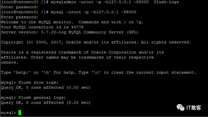 当输出目标为文件的时候,在 linux 下,直接使用 rm 命名删除即可,如果在开启了一般查询日志或者是慢查询日志,删除对应的日志文件,并不影响数据库的正常使用。网上有说需要停止 MySQL 服务然后重命名文件然后在创建新的文件啥的,在 Linux 下并不是必须的,不知道在 windows 下是什么情况,没兴趣试。