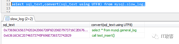 不管是 general_log 或者是 slow_log,对应的 SQL 语句都是二进制格式的,需要使用 convert(sql_text using UTF8)做一个转换,才变得具有可读性。