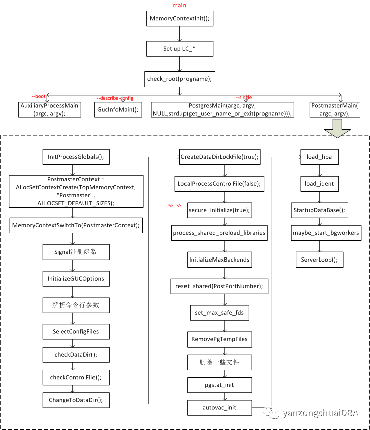 Postgresql启动流程模块划分。启动时首先会创建内存上下文TopMemoryContext作为内存的root,之后的内存都在这个下进行分配;然后设置一些LC_*系统变量;检查不能在root下运行postgres;然后进入4个分支:--boot为initdb进行初始化数据库的时候调用流程;--describle-config获取配置项值就退出;--single为单进程模式启动;PostmasterMain为正常启动PG时的调用流程。