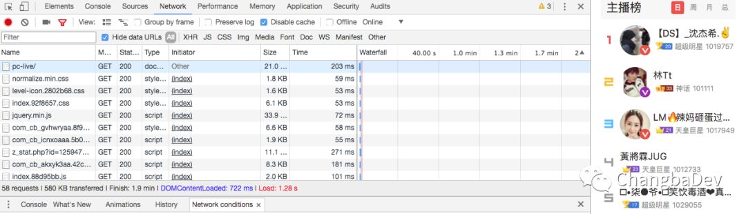 用Chrome浏览器打开我们直播间网站,并打开开发者工具Network窗口,下图就是我们站点资源的加载图