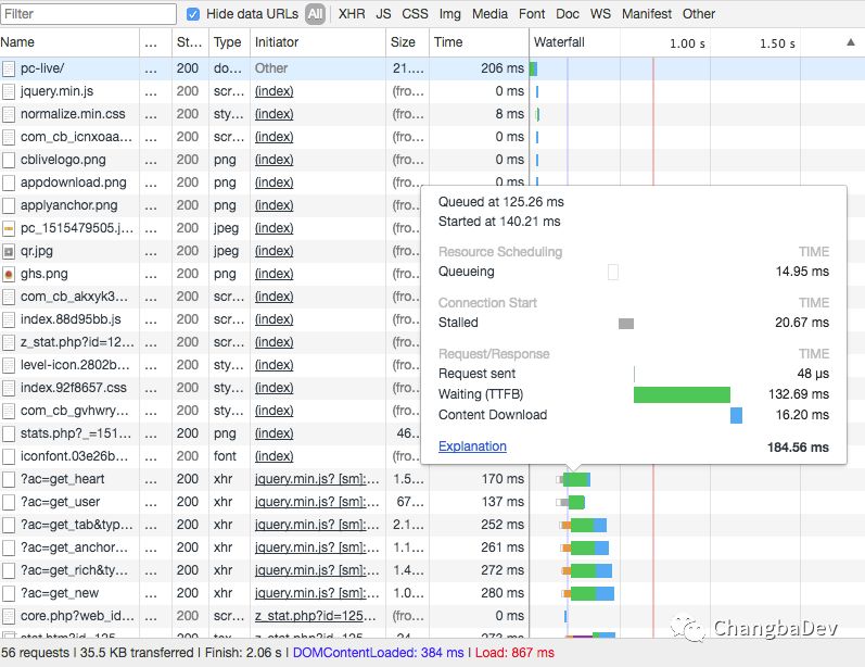整个资源加载并渲染出来时间大约是2秒左右(比较好的用户体验应该是在3秒以内),这个时间用户应该还比较接受,在没有优化之前 整个这个时间大约为4秒左右,右边小框是整个请求在这个阶段耗费的时间