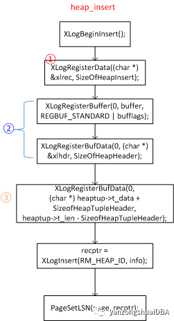 主要涉及3个重要的函数:XLogRegisterData、XLogRegisterBuffer和XLogRegisterBufData。这三个函数的作用分别是将WAL记录的特殊结构体数据注册到WAL,比如heap_insert中的xl_heap_insert结构体;将涉及到的buf注册到wal记录,比如heap_insert中page页赋予regbuf->page;将元组内容注册到WAL记录,比如insert语句的元组数据等。