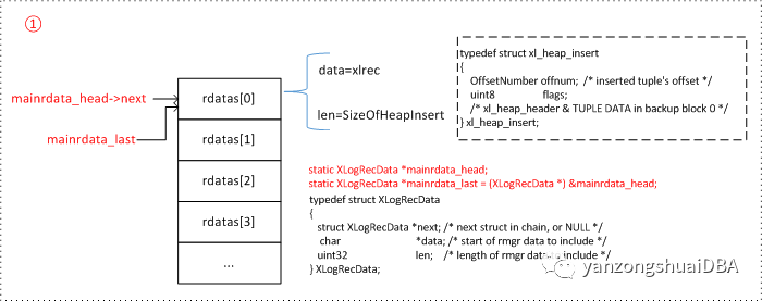 在构建WAL日志记录的过程中主要涉及2个数据变量:static XLogRecData *rdatas数组和static registered_buffer *registered_buffers数组。这两个数组分别用来保存WAL数据和管理rdatas链表。