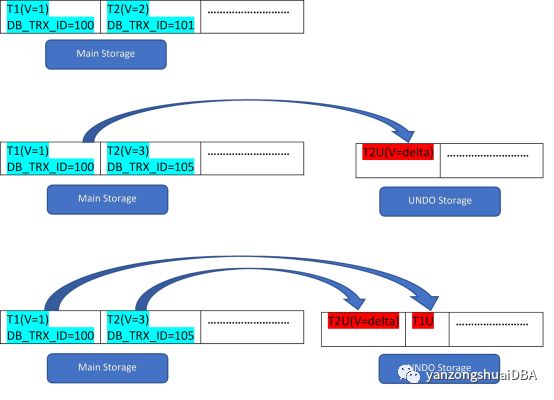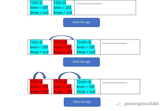 例如,两行记录:T1(值为1),T2(值为2),可以通过下面3步说明新记录的创建过程: