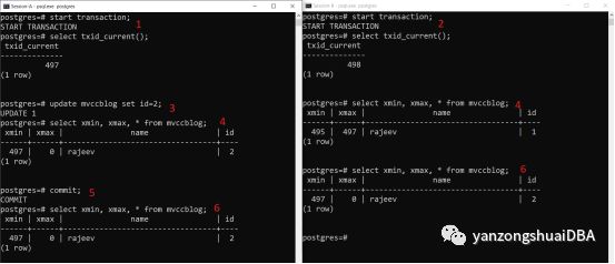 4、Session-A可以看到tuple的最新版本而Session-B看到另一个老版本。Session-A看到新记录的xmin为497,xmax为null;Session-B看到老版本xmin是495,xmax为497即Session-A的事务ID。这两个tuple版本都存在HEAP中,如果空间允许甚至存在同一页中。