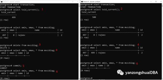 4、Session-A看不到当前事务已删除的记录;Session-B看到老版本,其xmax为499,499的事务删除的该记录