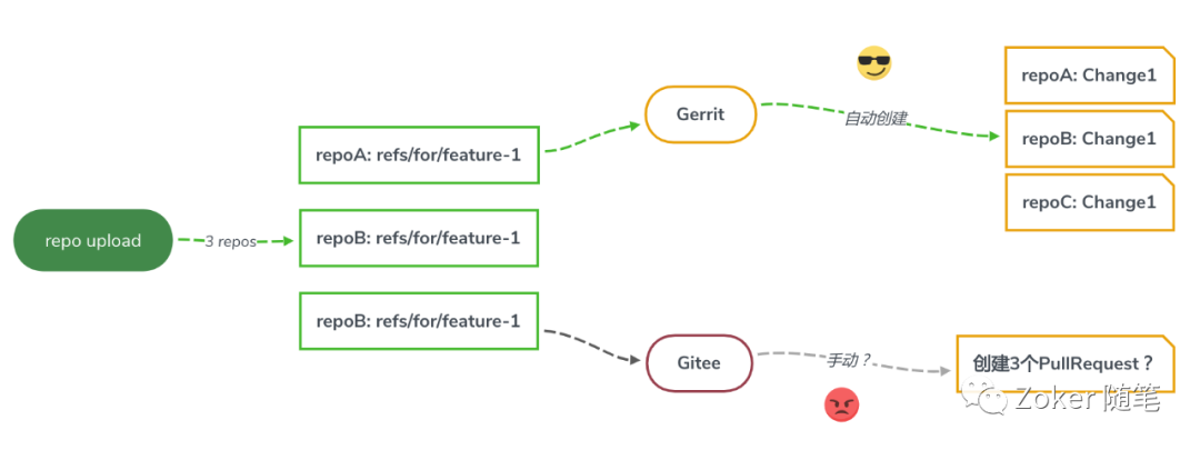 去年写过一篇文章《浅谈 Pull Request 与 Change Request 研发协作模式》,详细介绍了 PR Flow 以及 CR Flow 的区别,文末有说到 Gitee 应该提供推送分支自动创建评审的改进,刚好近期也听到很多关于平台支持 CR Flow 的声音,而且在不少客户内部也有类似需求,毕竟这个需求可以解放开发者的一部分精力,对于追求研发效能的当下,自然是一个不错的功能点,另外对于 Gerrit 转到 Gitee 的用户,也是一个平滑的过渡方案。所以写下这篇文章,探讨一下支持 CR Flow 平台的产品实现,并对 CR Flow 实现的底层原理做了一些实验性的工作,以供参阅。