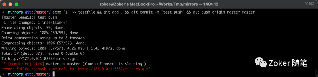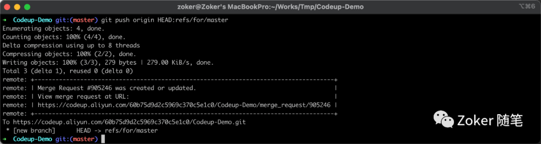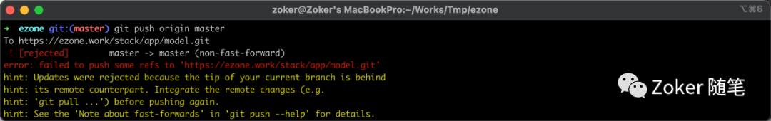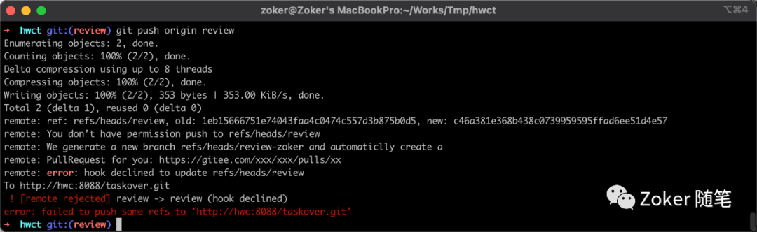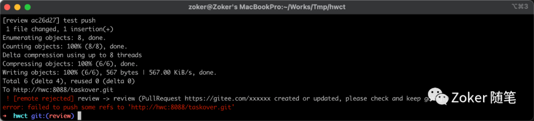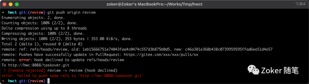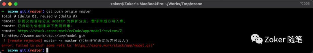 分支冲突的话,是无法继续推送的,这其实不太不合理,因为实际是要更新review-zoker
