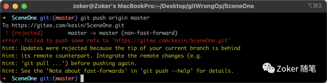 在推送的时候往往会遇到远程仓库的版本领先于自己本地的版本,这个时候如果我们执行推送操作,就会看到 Git 给到我们的提示:
