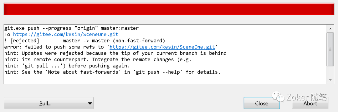 Integrate the remote changes (e.g.'git pull ...') before pushing again.再次尝试推送之前,请合并远程的变更到你本地(使用 git pull)