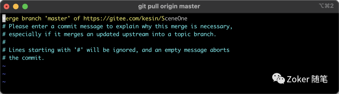 终端弹出了合并的提示,这是为当前的一次合并提交填写 Commit 信息的,我们默认即可,保存退出即可完成一次合并操作。