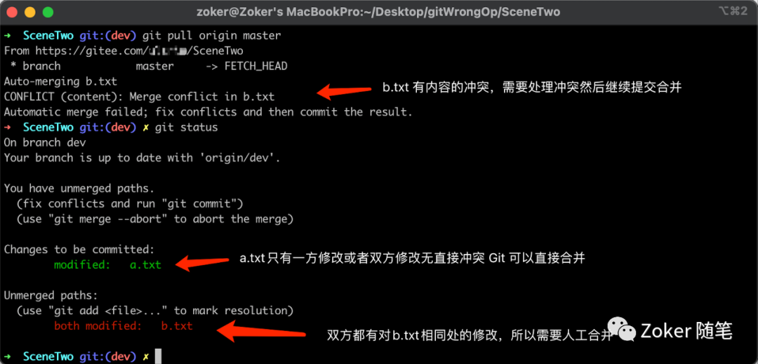 上面我们有说到,当遇到冲突的时候需要合并远端到本地,才能继续进行推送的操作,但是上面的例子是并没有任何冲突的理想情况下,但事实经常事与愿违,在开发过程中,文件之间的冲突是不可避免的,所以经常会遇到 Git 不能够自动合并的情况,所以我们需要自己进行代码的合并,通过对代码上下文以及业务的理解,合并出团队所「期望」的代码。