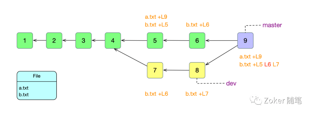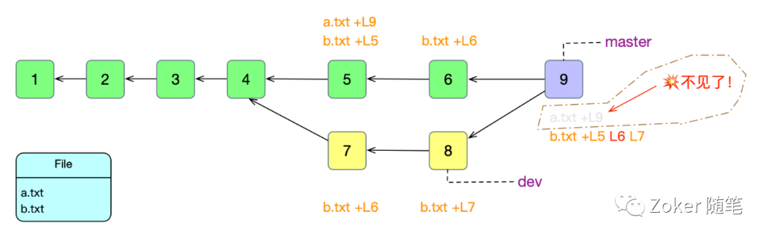 整个过程是常规的合并操作,是一种标准实践了,但是上线的那天晚上,当团队复核代码的时候发现,最新版本的a.txt