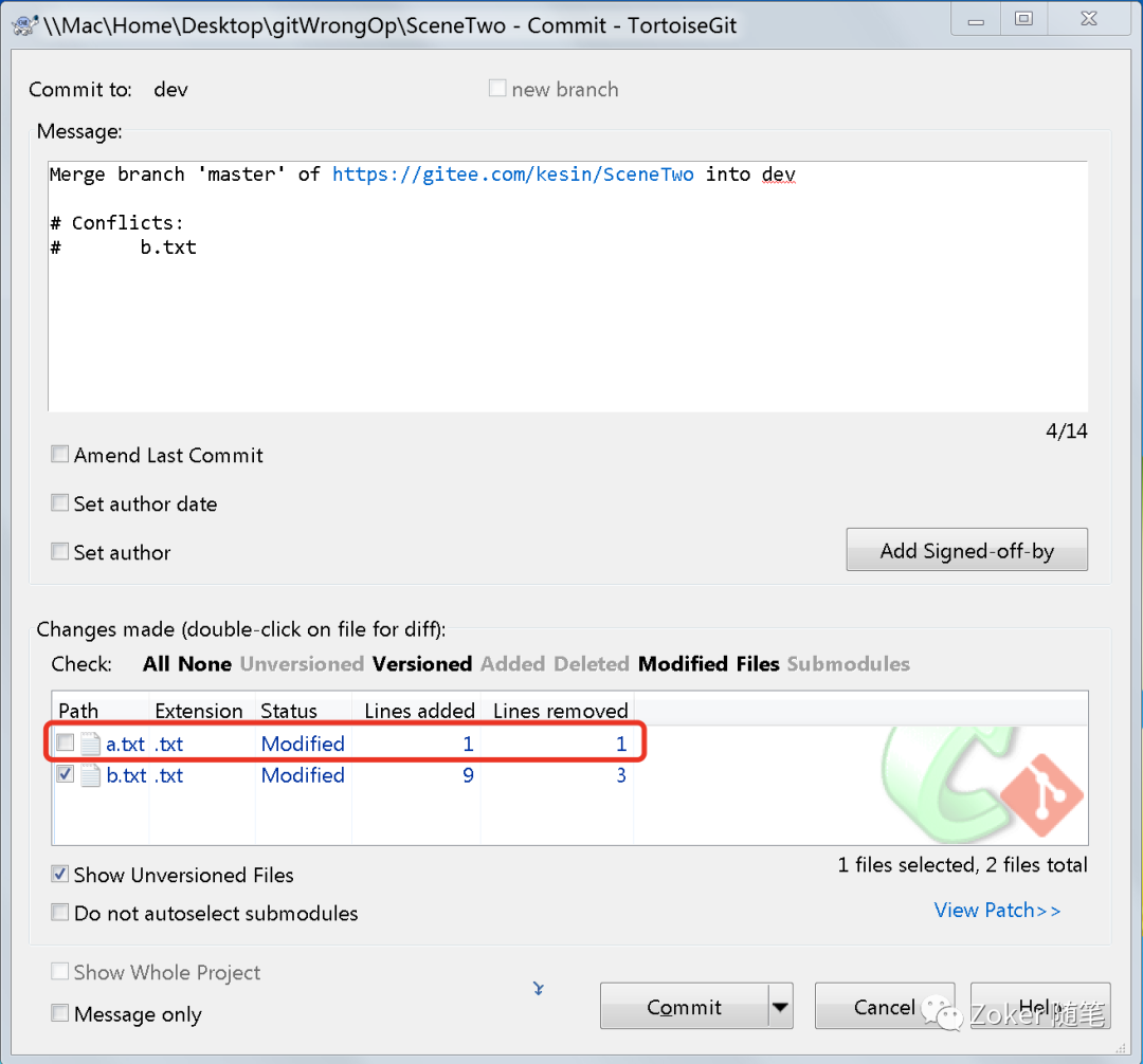 但是,在命令行合并的时候我们关注的都是冲突的文件,并不会人为的去变更默认加入暂存区的文件,所以一般情况下不会出问题,那么图形化工具在合并的时候是如何造成这种问题呢?看看下面这张图: