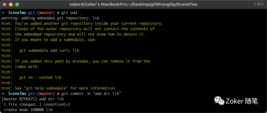 文件夹本身就是一个 Git 仓库,当我们直接复制到仓库里面去提交的时候,Git 其实是会有提示的,只不过可惜的是大部分人都不会关注这些警告: