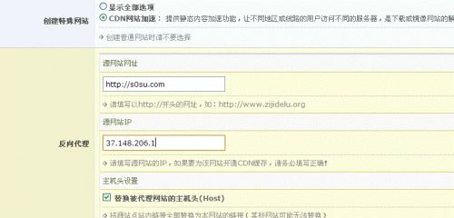 2、然后点击“选填”选项,在创建特殊网站中选择“CDN网站加速”,填入你的源网站域名和源网站的IP地址。(点击放大)