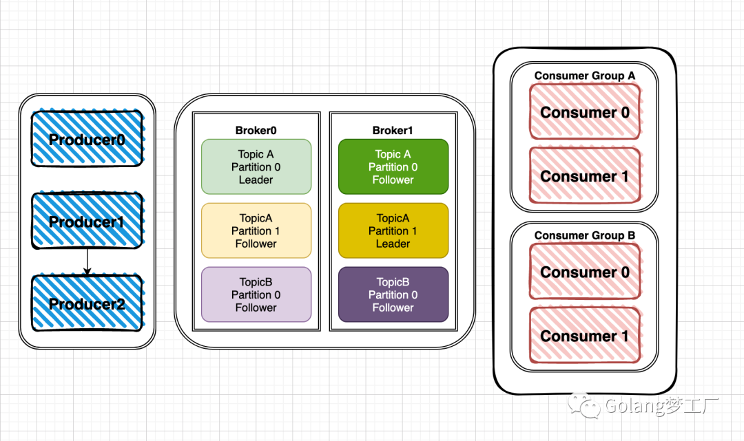 topic:可以理解为一个消息的集合,topic存储在broker中,一个topic可以有多个partition分区,一个topic可以有多个Producer来push消息,一个topic可以有多个消费者向其pull消息,一个topic可以存在一个或多个broker中。 partition:其是topic的子集,不同分区分配在不同的broker上进行水平扩展从而增加kafka并行处理能力,同topic下的不同分区信息是不同的,同一分区信息是有序的;每一个分区都有一个或者多个副本,其中会选举一个 leader