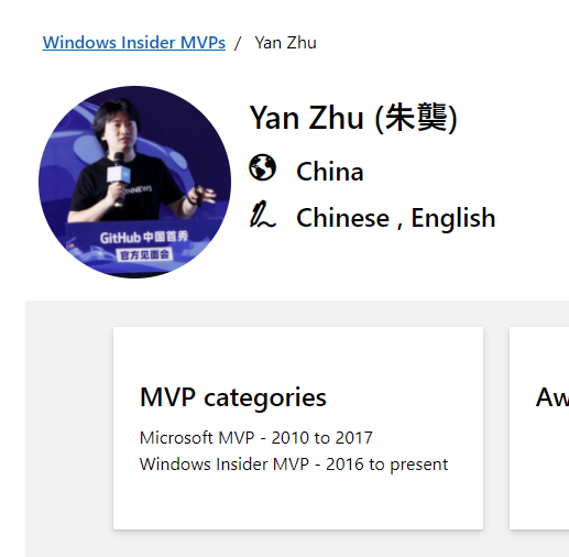 实际上,截至本文发稿,中国区的 Windows Insider MVP 只有两人。Ling Gao 老师及 Yan Zhu 老师。