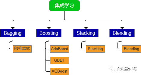 集成学习按照集成的思想,可以分为Bagging、Boosting、Stacking、Blending,共4种框架(见下图),由于Bagging和Boosting讨论的最多,所以咱们这篇文章也将把接下来的篇幅重点分给这两种算法。