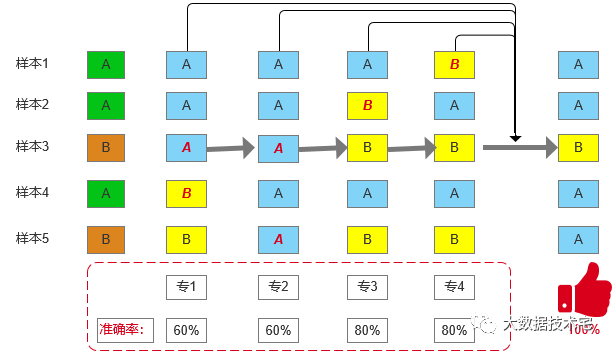 为便于各位小伙伴对Bagging和Boosting算法更好的记忆,这里同样以类似上述专家的例子讲述Boosting的过程(见上图)。为便于绘图(绘图花费笔者不少时间哦,觉得还不错的小伙伴麻烦点个“在看”,谢谢),这里把专家个数由6位调整为4位。好了,现在开始带你了解Boosting的流程。第一步,专家1对五个样本进行类别判断,从图片可知,专家1的正确率为60%;第二步,专家2开始基于专家1的预测结果进行判断,他会试图纠正专家1所犯的错误(虽然还是会犯少量的错误)。由于专家1是在对样本3和样本4的类别进行判断时出错的,所以专家2在进行数据抽取时会先提高样本3和样本4的权重,然后再进行预测。通过图片可知,专家2在样本4的判断上正确;第三步,专家3依据上一个专家(专家2)的结果,会采用专家2的做法,继续提高被专家2分错的样本3和样本5的权重;第四步,专家4会尝试纠正专家3在样本2上所犯的错;最后,通过对4位专家的预测结果采用设定的集合策略给出最终的判断结果。
