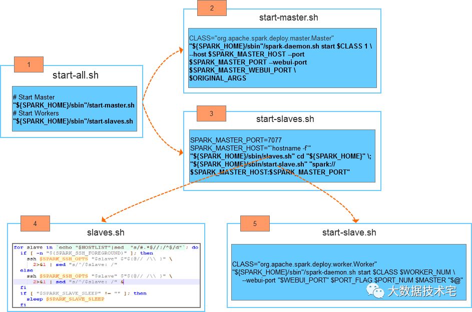 图1中挑出了5个主要启动脚本的部分内容,接下来简单解释一下: