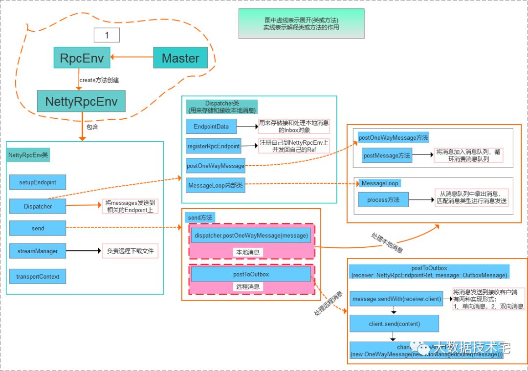 图2中被红色虚线圈住部分是Master启动过程中产生创建通信环境的过程,Worker创建通信环境的过程与此类似,除了红色虚线部分以外,就是spark所有模块公用的消息传递机制。spark的消息传递中,将消息分成两部分:本地消息和远程消息,处理本地消息和远程消息的过程不同,处理本地消息在Dispatcher模块,处理远程消息直接调用NettyRpcEnv的postToOutbox方法。图2中红色虚线部分展开过程如图3所示: