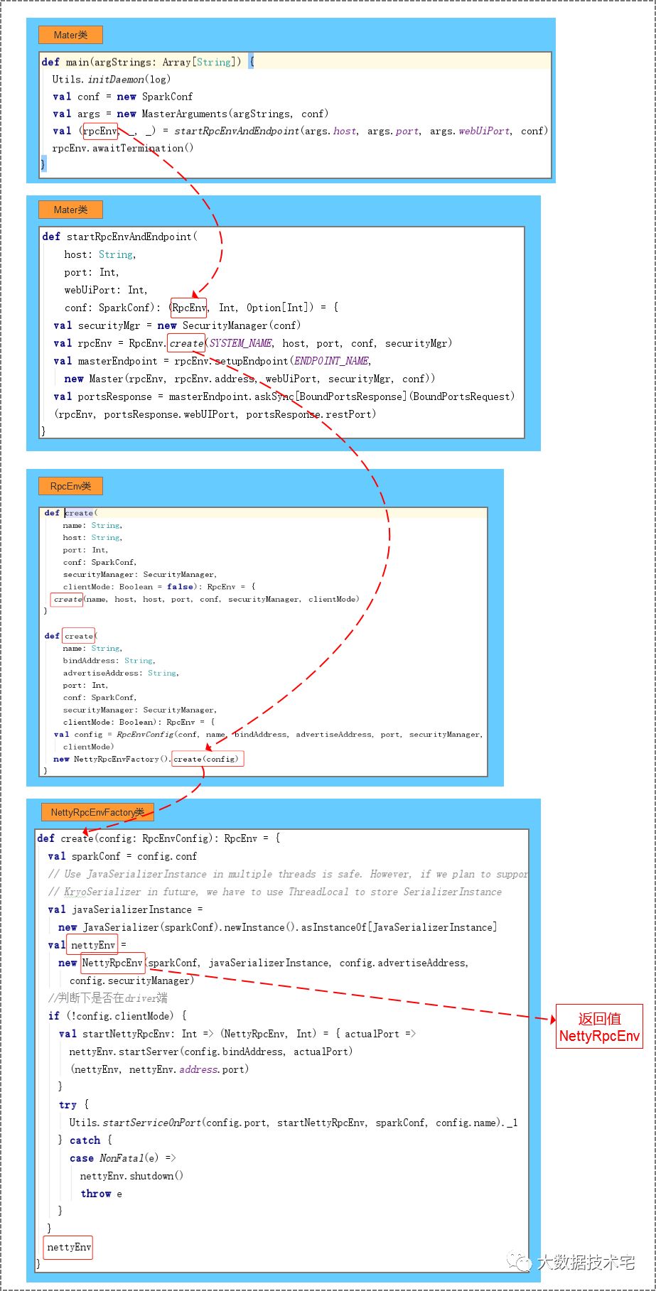 通过图3中一系列操作产生一个NettyRpcEnv实列,用于发送消息。图3,以Master通信环境创建为例,Worker通信环境创建于此类似。
