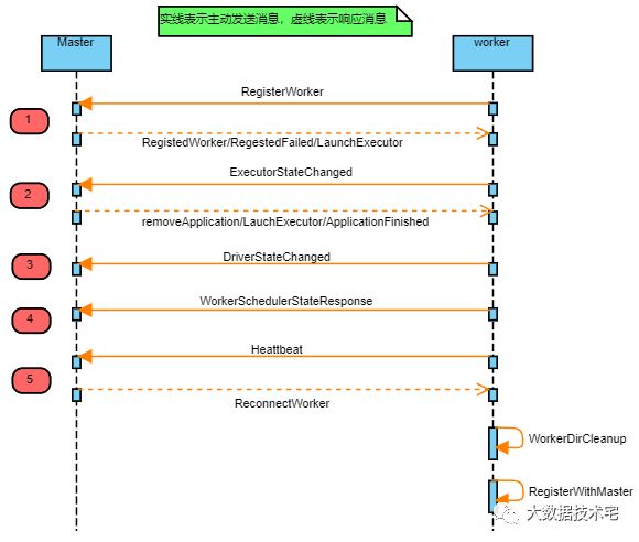 从通信的角度来看Master与Worker既是服务端又是客户端,既作为消息的接受方,处理消息,响应消息,又主动的发送一些消息。Master与Worker之间的消息传递如图4所示(只列举了部分消息):