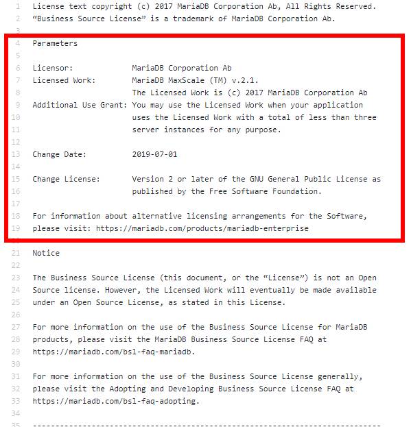 只看许可证可能不理解,我放个MariaDB的License文件给大家看下,地址:https://github.com/mariadbcorporation/MaxScale/blob/2.1/LICENSE.TXT。
