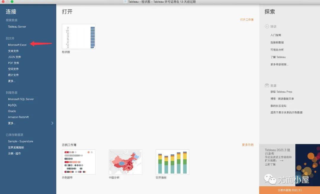 下面是打开Tableau之后的基础界面,可以连接到各种不同的数据源中,比如选择连接到本地的Excel文件。
