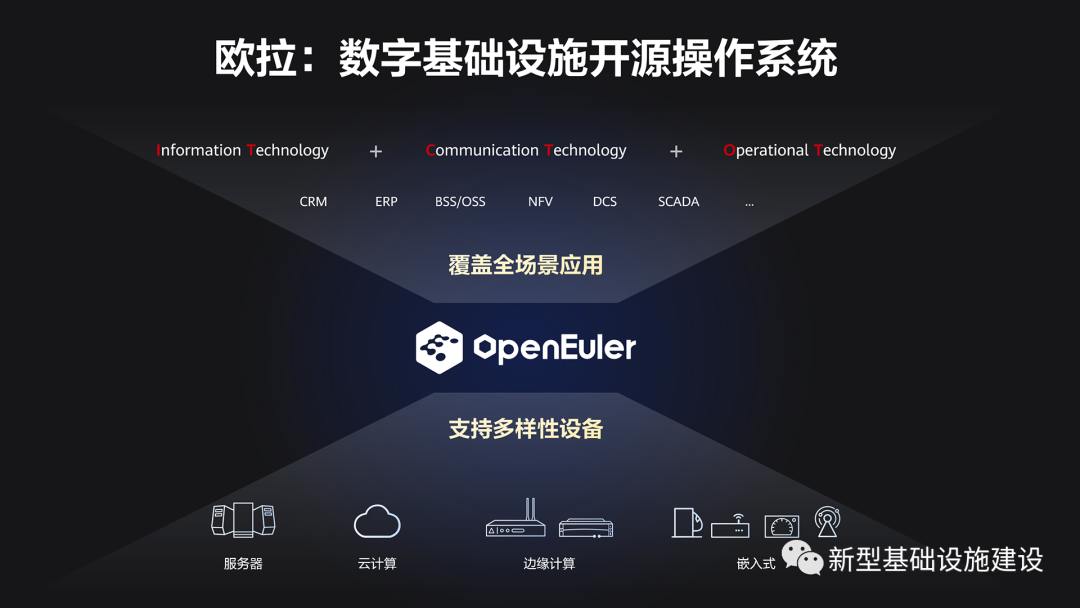鸿蒙之所以叫万物互联的智能终端操作系统,就是不管智能手机还是穿戴设备还是物联网设备,只要是终端产品,都可以搭载鸿蒙。基于鸿蒙,应用可以一次开发、适配多样性终端。鸿蒙是面向端侧的、欧拉是面向数字基础设施,是同样的道理。数字基础设施不管是服务器还是云的场景,还是通信和 CT、OT 的嵌入式设备,或者是边缘计算设备,都可以通过一套欧拉操作系统完成适配。从这个定位和整体理念来说,鸿蒙和欧拉是一致的。