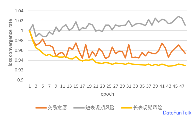 另外,多任务之间的权重如何选择也是一个问题。当任务较多的时候,尤其是有的任务比较容易学习、有的任务比较难学习的时候,极容易出现此消彼长的“跷跷板”现象,使得某些任务还不如单任务建模。从迁移学习误差界定公式(5)来看,如果某个任务是源域且难学习,源域误差较大会导致另一个作为目标域任务的泛化误差更大。调研了各种方法后,最终采用了两种动态平衡策略:以不同任务的损失函数方差作为权重的uncertainty weighting[9],拉平不同任务对共享层变量的梯度更新速度的gradnorm weighting[10]。通常来说,在特征有效性差不多的情况下正负样本比例越平衡的任务越容易训练、收敛率(后续损失/初始损失)低,动态调权可以拉平三个任务的收敛率(图 7)。由于是否交易、发生逾期风险的正样本比例呈现越来越低的递进关系,共享层的梯度被交易意愿任务主导(图 5),因此它的权重会被逐渐降低(图 6);短表现期风险任务的损失函数收敛率变化最小,可以认为一开始就被训练到极限状态了,因此它的权重先升高后降低;训练后期主要聚焦在长表现期风险任务,因此它的权重持续上升。