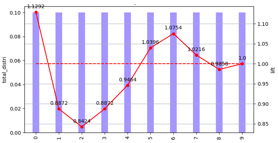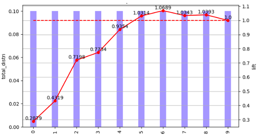 图 8 按交易意愿分从低到高等频分箱后的累计风险提升度