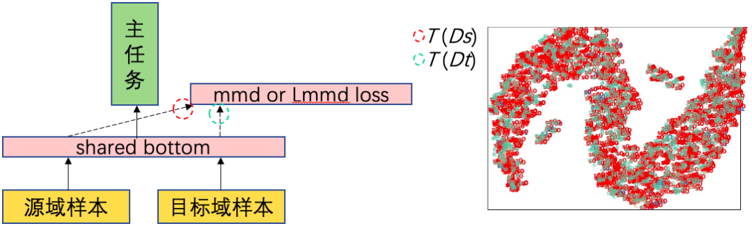 隐式方式可以通过对抗学习,在目标域与源域之间添加GAN的判别器来实现[11]。显示方式可以通过在主任务外添加目标域与源域之间的边缘概率MMD距离损失函数[12],或者条件概率LMMD距离损失函数[13]来实现。隐式方式不一定能真正混合变换后的特征分布(图 9a),但是分布距离度量方式直接能把变换后的特征分布混合起来(图 9b)。