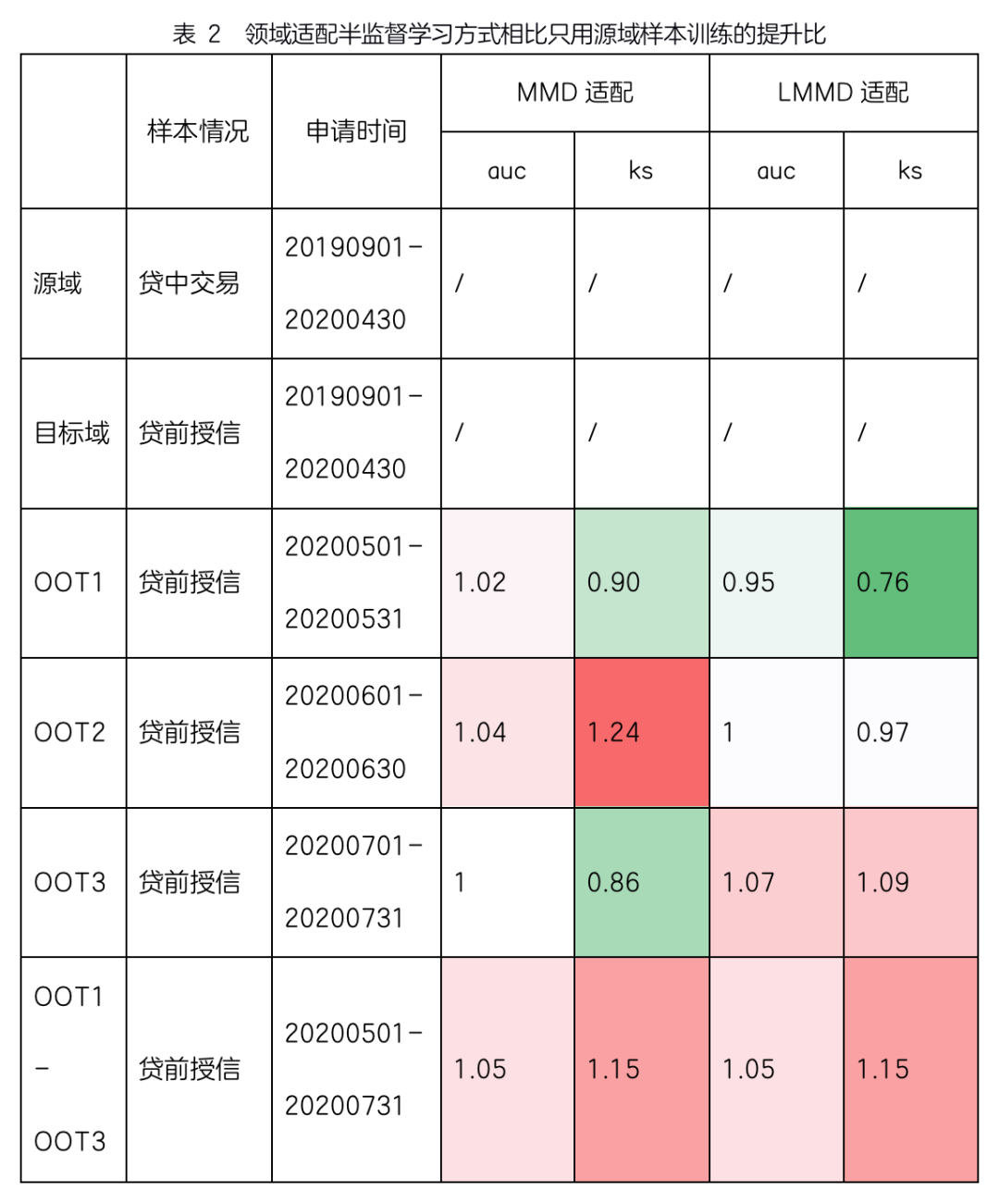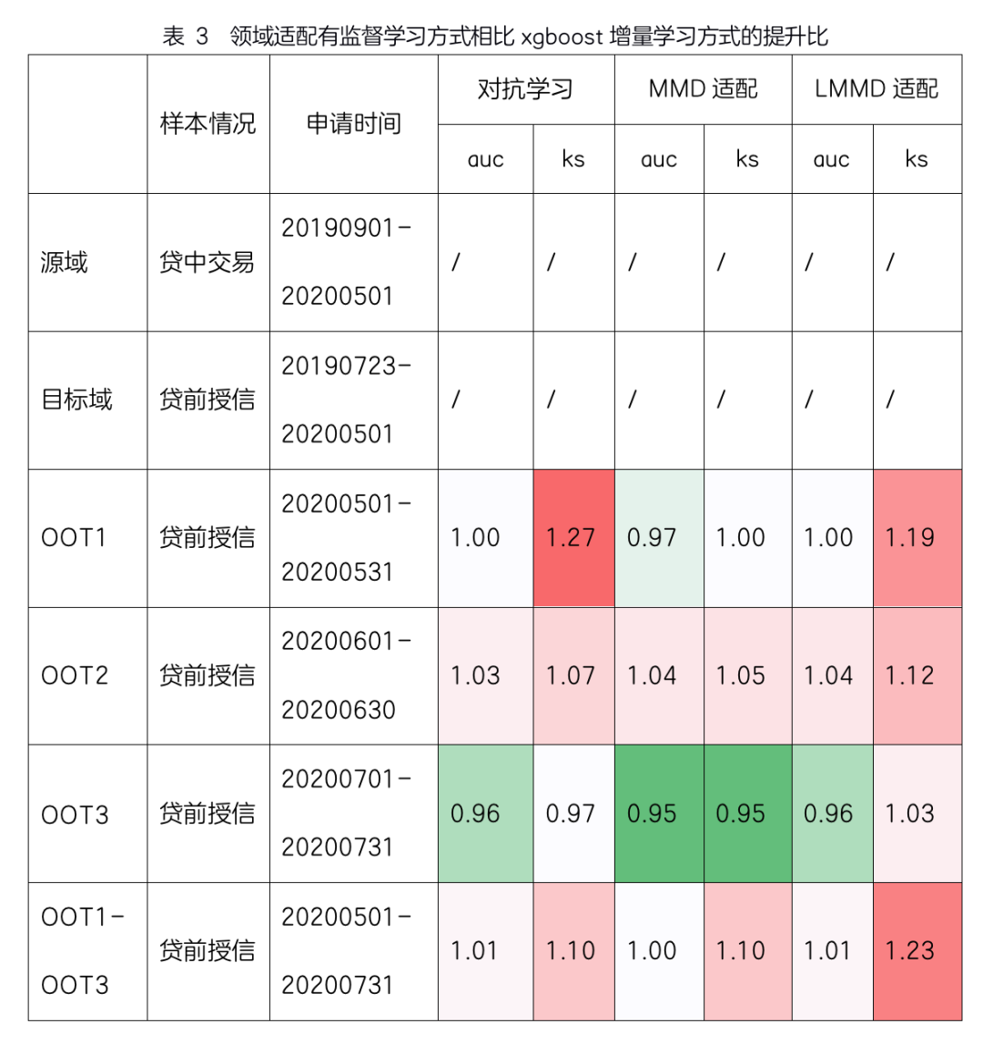 可以采用目标域无标签的半监督学习方式进行训练,即只把源域样本送入主任务学习,这对于新开策略、样本还没有进入表现期的场景适用;也可以采用目标域有标签的有监督学习方式进行训练,即把源域和目标域样本混合在一起送入主任务学习,另外增加一个分布距离损失函数项,这对于想扩大样本量、但远期与近期样本同分布假设失效的场景适用。由于有监督方式下目标域有标签,适配条件概率Ps(x | y) Pt(x | y)的LMMD方式能更好地发挥作用(表 3);半监督模式下由于目标域的标签是用当前分类器预测的伪标签,LMMD方式与只适配边缘概率Ps(x) Pt(x)的MMD方式相比没有优势。